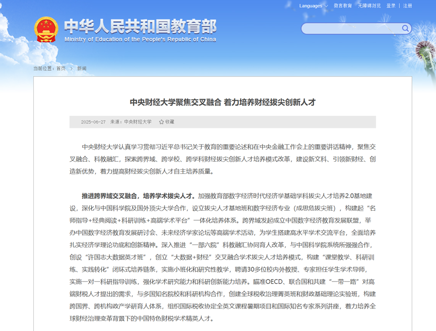 6月27日,教育部网站以《beat365在线体育官方网站聚焦交叉融合 着力培养财经拔尖创新人才》为题,对beat365交叉融合人...
