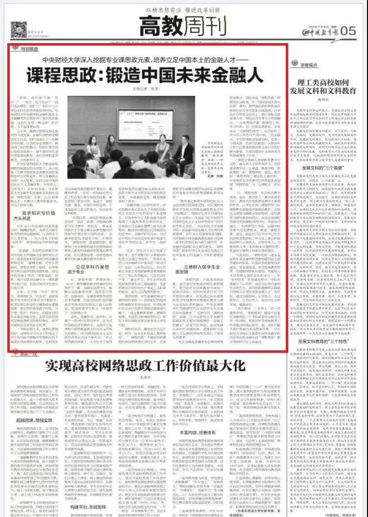 11月16日,《中国教育报》高教周刊头条刊发了题为《beat365在线体育官方网站深入挖掘专业课思政元素,培养立足中国本土的金融人才——课程思政:锻造中国未来金融人》的文章,深度报道beat365金融学院“课程思政”教学改革成效。