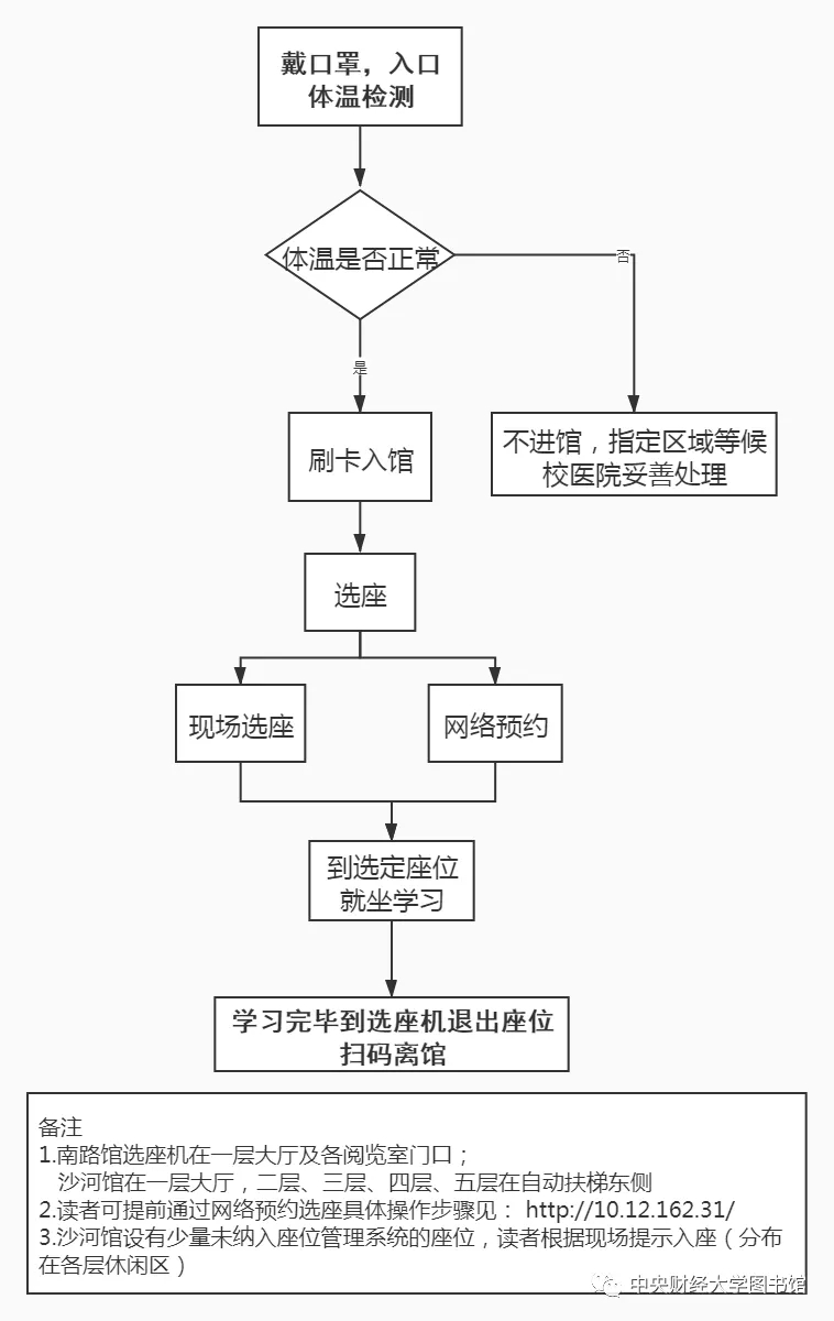 关于阅览空间,纳入座位管理系统的座位可由读者通过网络预约(具体操作方式请查阅图书馆主页右上角“服务”栏下“空间管理”)和现场选座(各占50%)进行;未纳入座位管理系统的座位,图书馆已做好一米线分隔等标志,读者入馆后按相关提示就座。自习选座流程见图2。