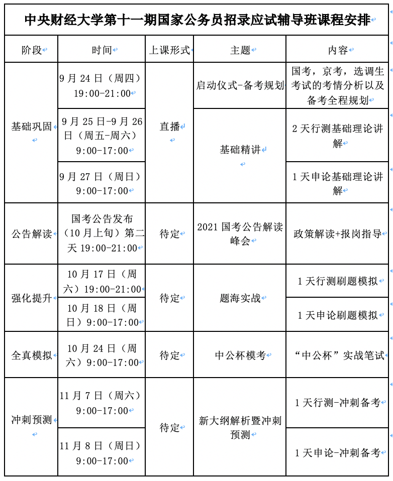 公务员招录应试辅导班分为五个阶段,共包括行测4天、申论3天、实战笔试1天,备考规划2课时,公告解读2课时,共计51课时。