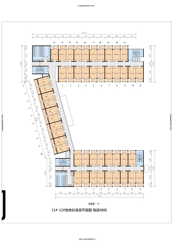 11#、12#学生宿舍一层设置门厅,值班室,辅导员值班室,一层宿舍34间、标准层宿舍48间,共计宿舍274间。