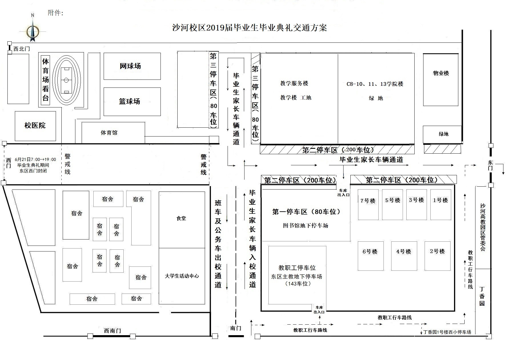 2.6月21日(周五)全天,请师生员工将车辆停放至东区主教学楼地下停车场、东区食堂地下停车场、丁香园周边地面停车场;请学生家长将车辆停放至东区图书馆地下停车场、东区龙马路东段两侧、乾坤路北段两侧,具体交通方案见附件。