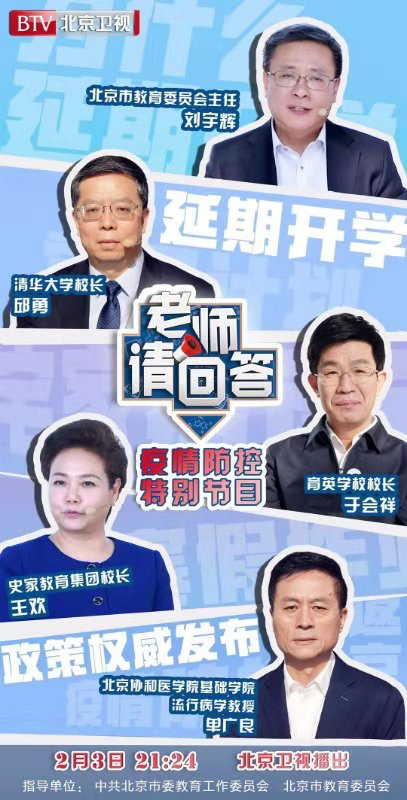 为进一步加强在家学生思想教育和心理疏导,向学生讲清楚延期开学以及不离家、不返校的必要性,指导学生在家期间的学习生活,市委教育工委、市教委联合北京电视台录制了《老师请回答》特别节目,2月3日起每周一、周二21:18在北京卫视播出,邀请顶级专家权威发布必备防疫、学习、生活指南。