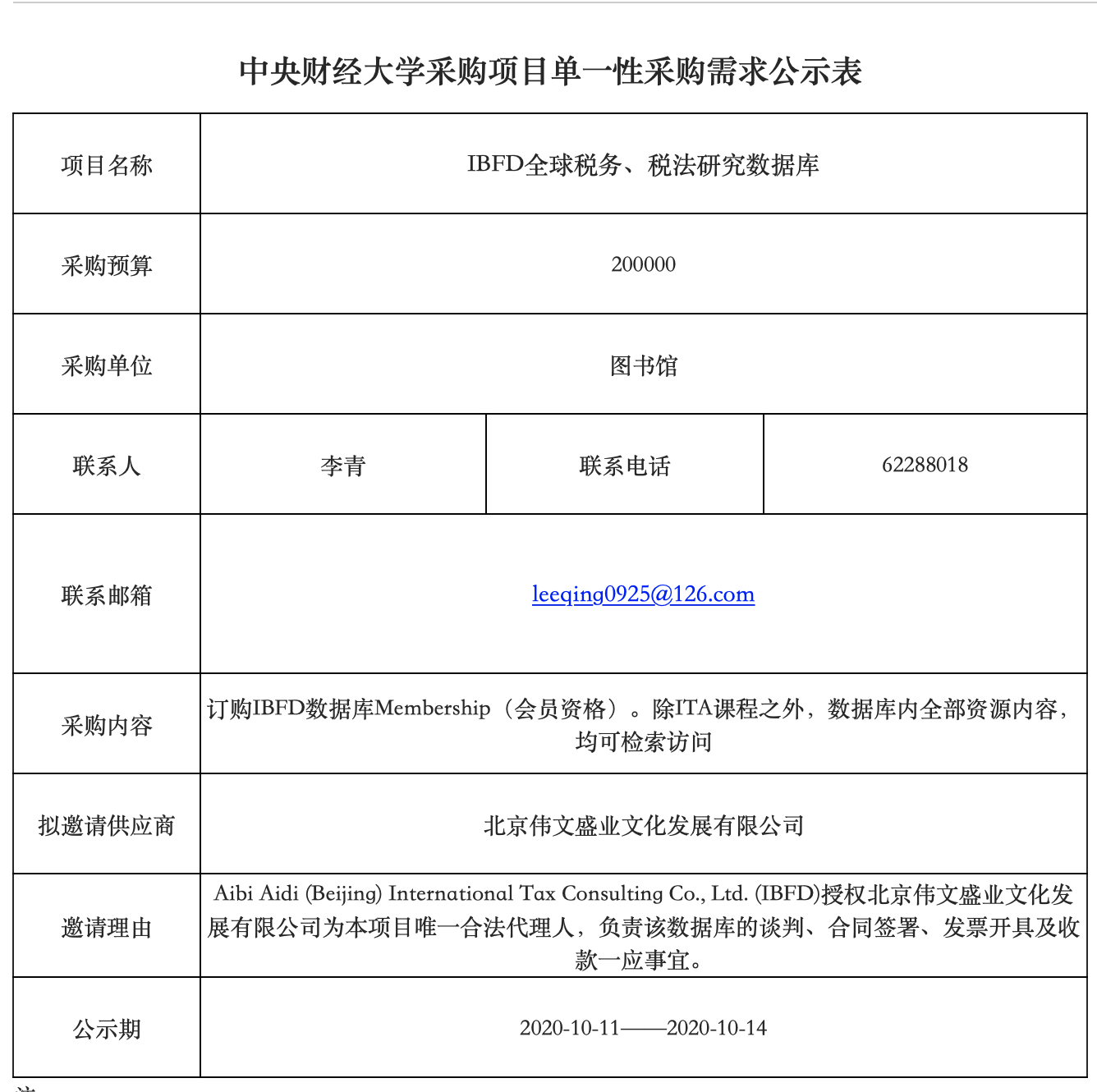 IBFD全球税务、税法研究数据库项目单一性采购需求公示表